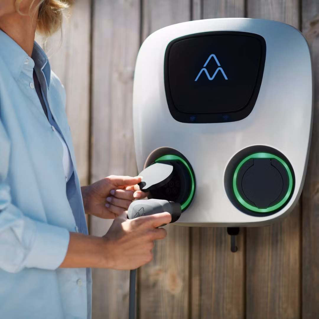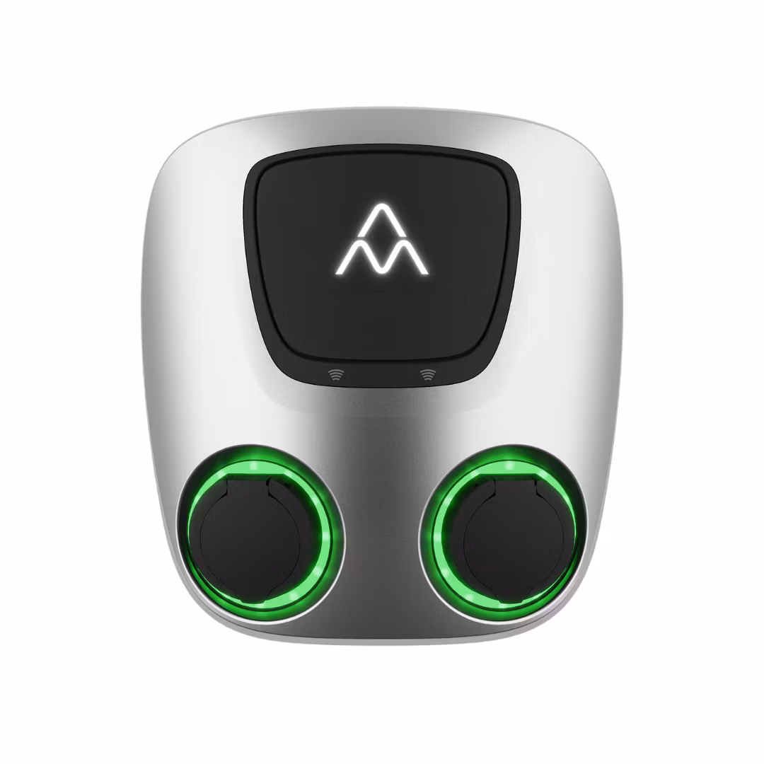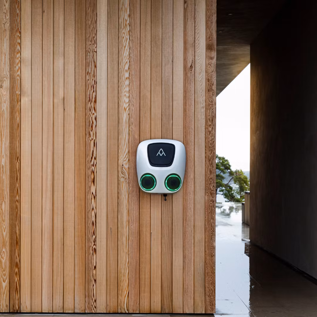 Charge Amps Aura 22kW 3-faset ladeboks med to stikkontakter, der kan lade 2 x 22 kW på samme tid. Stilfuldt design i genbrugsmateriale.
