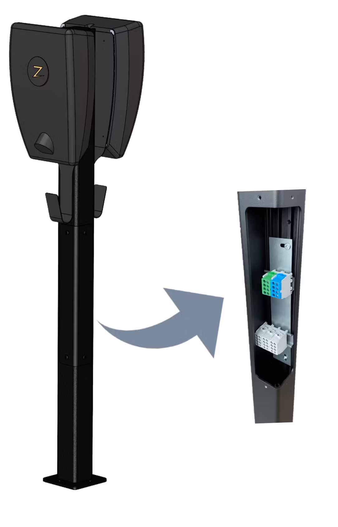 Har du en parkering uden vægge at montere ladestationen på? Her er det perfekte supplement til din Zaptec Pro. Fremstillet af høj kvalitet aluminium og beskyttet med en ridsefast sort pulverlakeret finish. Dens integrerede kabelholder muliggør nem og pæn opbevaring af din opladningskabel.